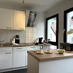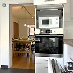 Kuchnia obejmuje kuchenkę mikrofalową, czajnik elektryczny i lodówkę, a także urządzenie do parzenia kawy/herbaty dla wygody gości. Apartament o powierzchni 99 m^2 znajduje się kilka kroków od najbliższego przystanku autobusowego Justizgebaude.